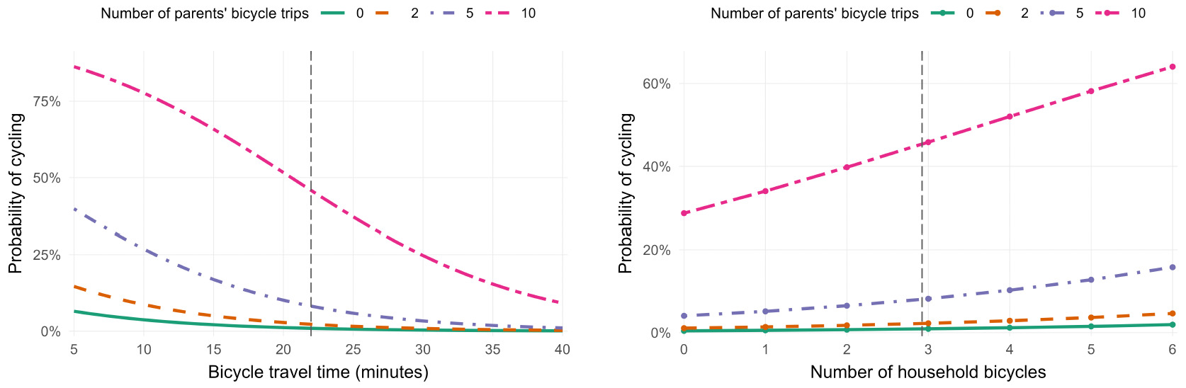 Fig. 1(a) shows that the probability of cycling declines as bicycle travel time increases. However, higher parental cycling behaviour shifts the curves upward, indicating that adolescents exposed to more parental cycling activity are more likely to cycle, even for longer trips. The dashed line marks the sample-average travel time. In Fig. 1(b), the probability of cycling increases with household bicycle ownership, with a noticeably stronger effect under a higher number of cycling trips by parents.