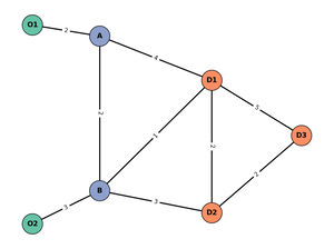Worked example. Consider two origins with resident workers and and three destinations with job capacities Link costs determine on a small network (Figure 2).