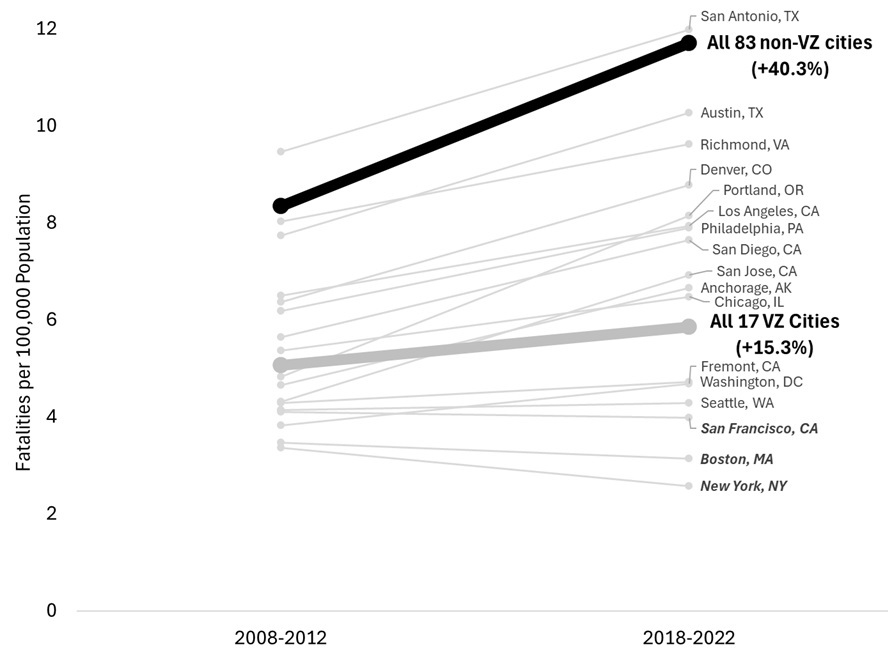 Traffic deaths increased in the US during the 2010s while continuing to decrease in most other high-income countries (International Transport Forum 2022; Badger and Parlapiano 2022). US traffic fatality rates increased the most in large cities (defined here as the 100 most populous US cities in 2020), hindering progress toward a vision of zero deaths in the US transportation system (USDOT 2022; Shahum 2016). Comparing 2008-2012 with 2018-2022, the annual traffic fatality rate per 100,000 people increased by more than 33% across the 100 largest US cities (from 6.97 to 9.28) but less than 5% in all other parts of the country (from 12.03 to 12.59) (NHTSA 2025). Fatality Analysis and Reporting System (FARS) data show similar results when 2020 is excluded. The trend started prior to the COVID-19 pandemic and continued into the 2020s.