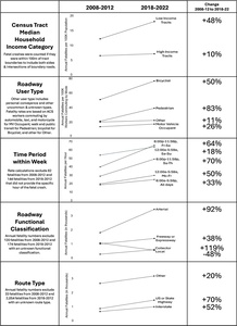 We ask the following questions: How did large-city fatality rates change by neighborhood income level, transportation mode, hour of week, and roadway classification between 2008-2012 and 2018-2022? What city-level characteristics were associated with large city fatality rates in 2008-2012 and 2018-2022?
