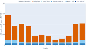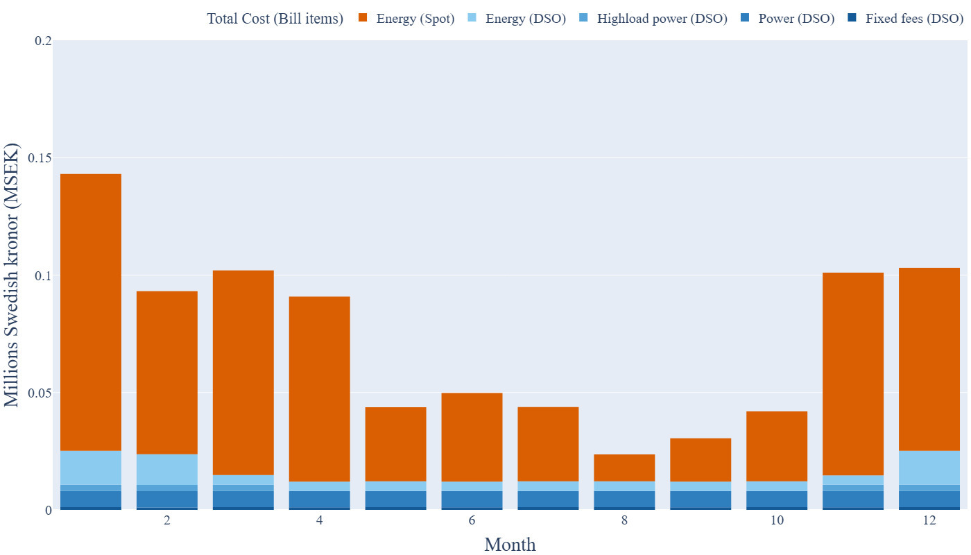 Figure 2 provides background on seasonal variation under Skövde Energi Elnät’s tariffs (2024). Wholesale prices show pronounced seasonality, driving large month-to-month differences in total cost, while network charges vary less across months. While this underscores that energy prices contribute substantially to total cost, public transport services with daily/weekly operating patterns cannot meaningfully shift charging across seasons; therefore, seasonal variation is informative context rather than a strategy for cost reduction in this application.