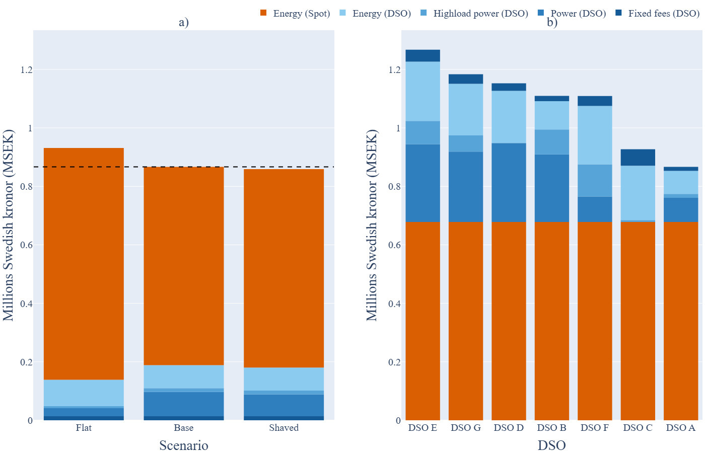 Figure 3a presents the implied end-use electricity costs of the three charging scenarios under Skövde Energi Elnät’s 2024 tariffs. The flat scenario has the highest total cost; while it eliminates demand peaks and minimizes subscribed power capacity charges, its evenly distributed profile shifts a substantial portion of charging to hours with higher wholesale prices. Because wholesale energy constitute the largest component of total cost, the Flat scenario performs poorly despite its low network-tariff charges.