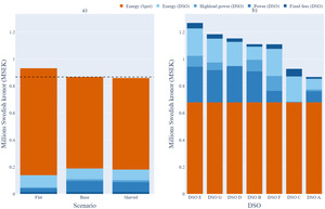 Figure 3b compares Baseline costs across DSO concession areas within the Skövde municipal area. This illustrates the user cost implications of relocating the bus charging in Skövde (i.e., relocating the bus depot) to an adjacent service area. Despite common wholesale prices across these areas, total electrcity costs differ substantially among DSOs due to tariff structure differences. The lowest-cost DSO (Skövde Energi Elnät)is 46% below the highest-cost DSO (Sjogerstads Elektriska Distributionsförening). These differences illustrate the potential for spatial load shifting, if charging opportunities were available in neighboring concession areas even within a single municipal area. Wholesale energy costs could be minimized by temporal load shifting, but the effect would be identical in any of these network areas; by contrast, the tariff structures of different DSOs play a bigger role in encouraging spatial load shifting.