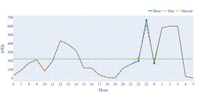 Flat scenario: Redistributes total daily energy evenly across all hours, producing a flat load curve. This limiting case is illustrative of the minimal peak power load for a given energy consumption, although it is presumably operationally unrealistic.