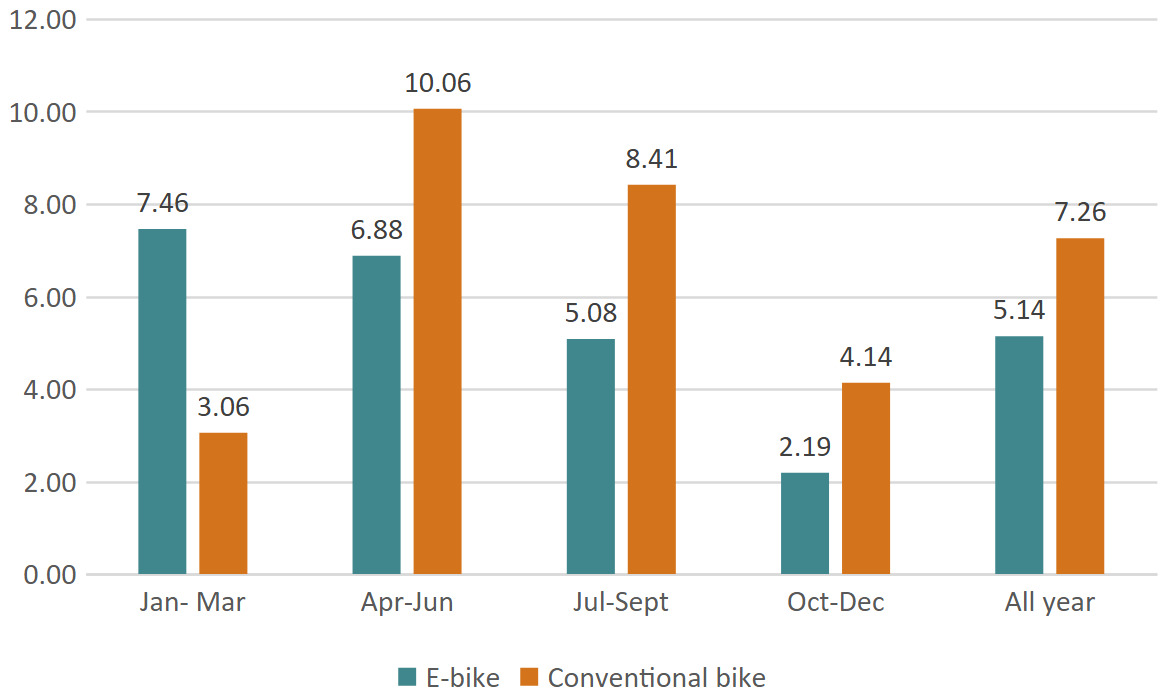 Figure 1 illustrates the seasonal pattern of injury risk by quarter. Overall injury risk is lower for e-bikes (5.14) than for conventional bicycles (7.26). The elevated risk for conventional bicycles is present in spring, summer and autumn, whereas e-bikes show a higher risk during the winter period.