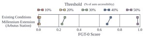 Arbutus has lower infill potential, but higher existing density allows conversions to roughly double the station area population. However, while the raw unit increases are sizeable, the amount of LICO units relative to the existing LICO population combined with the lower station area accessibility ultimately moderates the impact on FGT-0 scores. However, we found that the Millennium line extension itself leads to a sizeable FGT-0 reduction at the 30th- and 40th-percent thresholds (Figure 3).