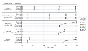 Northfield, with similarly low access as Arbutus, benefits from its peripheral location with more opportunity sites. The scale of new development in housing and employment increases offsets lower accessibility and generates a roughly 30% reduction in FGT-0. Cooksville and Panama Stations further benefit from suburban contexts in larger metropolitan areas. These sites have both high accessibility (above the 90th-percentile) and numerous larger opportunity sites that allow for significant increases in housing and density. At the approximate 95th percentile of vehicle access, they reduce FGT-0 by about 10% in Mississauga (Cooksville) and nearly 20% in Brossard (Panama).