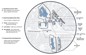We examine under-developed land near transit stations in five mid-sized Canadian cities: Panama Station (Brossard, QC); Cooksville Station (Mississauga, ON); Northfield Station (Waterloo, ON); McKernan-Belgravia Station (Edmonton, AB); and Arbutus Station (Vancouver, BC). This work is part of a partnership between the University of Toronto, Canadian Urban Institute, and Government of Canada. For each case study, the design team generated development proposals for two scenarios that underwent rigorous design and financial feasibility assessment. Both focus on infill on vacant parcels, with some redevelopment of underutilized parcels. The “trajectory” scenario extends existing development patterns, typically through fewer higher-density developments. The “optimized” scenario addresses regional housing needs and site-specific advantages with more developments and gentle density. Figure 1 shows opportunity site selection around Panama Station, and Table 1 provides key scenario attributes (Supplementary Information A). Though Arbutus Station is under construction, we created a modified GTFS feed including the future subway service for the following accessibility analyses (Supplementary Information B).