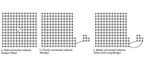 The betweenness centrality values for all three networks are shown in Figure 2. As all three networks have 168 nodes, betweenness centrality values are directly comparable. In the first network, Diagon Alley unsurprisingly has the highest betweenness centrality value, as it serves as a shortcut in an otherwise perfect grid. It has a betweenness centrality value of 1,296. In the second network, the bridge has the highest betweenness centrality, of 1,280—close to but below the value for Diagon Alley, despite a clearly more important role in resilience. In the third network, despite the addition of the long bridge, the short bridge is still the shortest route for all access to the island. The betweenness centrality of the short bridge remains 1,280, even though it is clearly not nearly as critical to network function now that there is an alternative. The betweenness centrality of the long bridge is zero, because there is no path where taking that bridge is shorter than taking the short bridge. Betweenness centrality completely misses redundancy if that redundancy entirely consists of paths that are (maybe only slightly) longer than the shortest path.