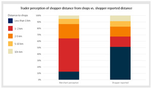 Traders were found to overestimate the distance customers travel to visit their businesses. Our results showed that over half (51.2%) of shoppers lived less than 1 kilometer from the shopping street. In contrast, traders on average estimated that only 12.6% of customers live within this distance (Figure 3). These results confirm H3, demonstrating substantial discrepancy between trader perception of customer travel distance and that reported by shoppers.